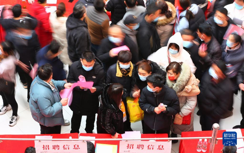 求職人員在山東省滕州市“春風(fēng)送崗”春季人才招聘會上尋找就業(yè)崗位(2022年2月19日攝)。 新華社發(fā)(李志軍 攝)