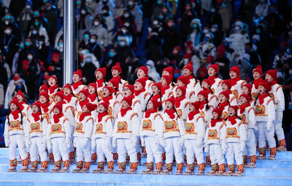 2月4日晚,第二十四屆冬季奧林匹克運(yùn)動(dòng)會(huì)開幕式在北京國(guó)家體育場(chǎng)舉行。這是“馬蘭花兒童合唱團(tuán)”用希臘語在開幕式上歌唱。新華社記者曹燦攝