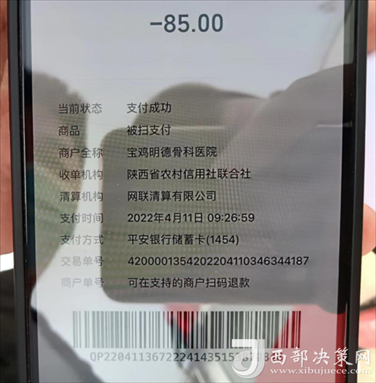 做核酸的市民提供的繳費截圖發(fā)現(xiàn),他們兩個人做完核酸繳費85元,分別要做咽拭子和鼻拭子兩個項目,收款商戶單位全稱為:寶雞明德骨科醫(yī)院。