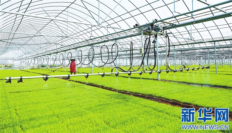 在江西省新余市渝水區(qū)新宋村的育秧大棚內(nèi),一臺自動化噴灌機(jī)沿著軌道勻速給秧苗灌溉。新華網(wǎng)發(fā) 張翰林 攝