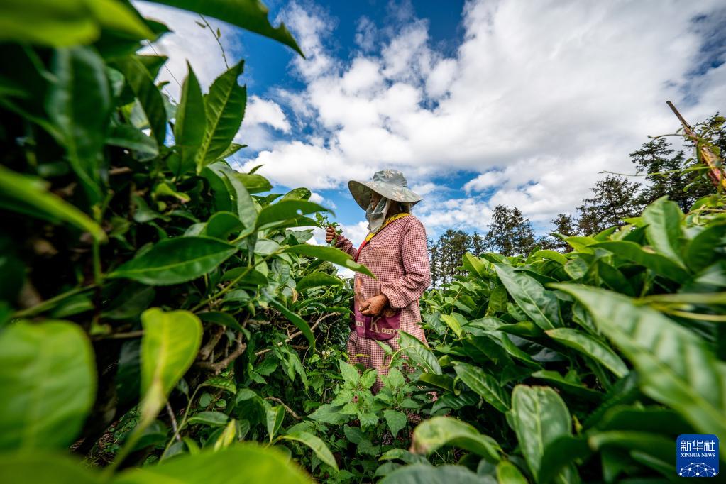 農(nóng)戶在普洱市思茅區(qū)南屏鎮(zhèn)整碗村的有機(jī)茶葉基地采茶(5月13日攝)。新華社記者江文耀攝