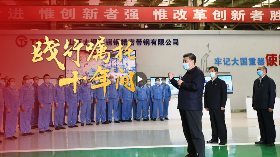 太鋼人時(shí)?;貞浧鹆?xí)近平總書記2020年5月來考察時(shí)的情景。那一天,在轟鳴的車間,總書記拿起一片“手撕鋼”——厚度僅為0.02毫米的不銹鋼箔材仔細(xì)察看,用手指輕輕扭折了一下,稱贊道:“工藝確實(shí)好,就像錫紙一樣薄,百煉鋼做成了繞指柔。”