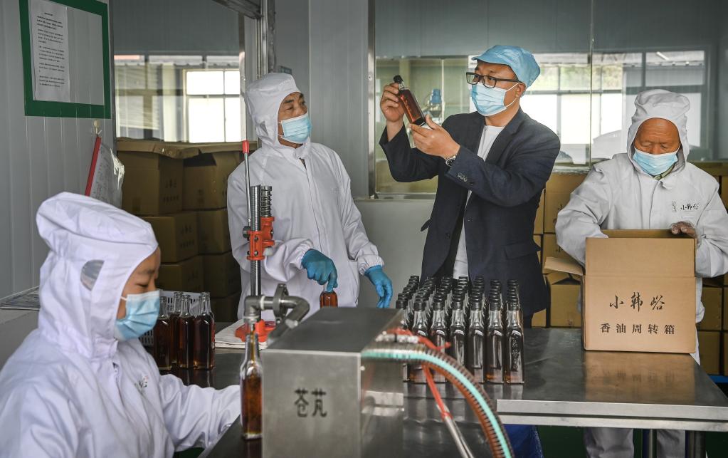 小韓峪村第一書記馮德全(右二)在小韓峪村小磨香油廠檢測香油品質(zhì)。新華社記者陶明 攝