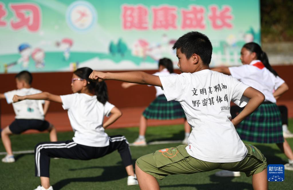 在陜西省安康市平利縣老縣鎮(zhèn)中心小學(xué)的操場上,學(xué)生們在課后參加武術(shù)社團活動(2020年9月7日攝)。新華社記者 李一博 攝