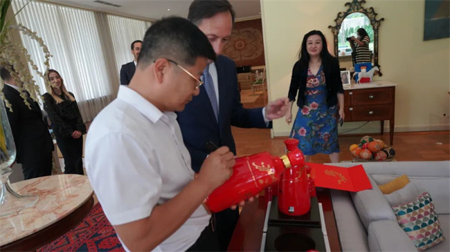 6月27-30日,由陜西西鳳酒股份有限公司主辦的“鳳香彌久傳遞友誼,合志同方共話未來——紅西鳳走進大使館”系列活動在京成功開展。6月28日下午,陜西西鳳酒股份有限公司副總經理高洪濤一行抵達葡萄牙駐華大使官邸,與葡萄牙駐華大使杜傲杰進行了深入的溝通交流,積極尋找文化共通點,加速推動中國白酒國際化。高洪濤與在場嘉賓分享西鳳酒所蘊含的歲月沉淀、醇香典雅的悠久文化,分享西鳳品牌發(fā)展過程中的動人故事。陜西西鳳酒股份有限公司品牌管理部部長姜承輝及隨行人員參加了此次活動。