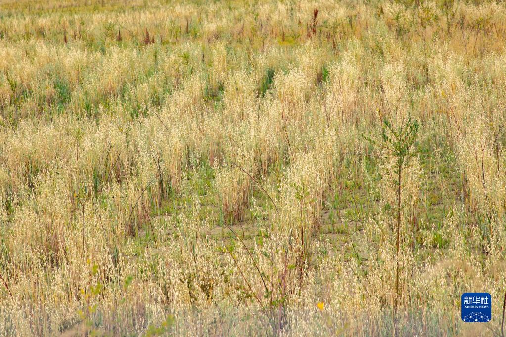 這是黃河瑪曲段干流沿岸一處阻沙林帶建設區(qū)域的草方格沙障內(nèi)的植被(9月16日攝)。新華社記者 郎兵兵 攝