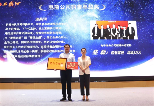 西鳳股份公司總經(jīng)理助理趙永紅為市級經(jīng)理銷售卓越獎獲得者頒發(fā)榮譽(yù)證書與獎金