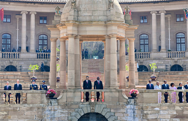 8月的比勒陀利亞,晴空萬里,惠風(fēng)和暢。總統(tǒng)府廣場鮮花盛開,中南兩國國旗迎風(fēng)飄揚(yáng)。在總統(tǒng)摩托車隊(duì)護(hù)衛(wèi)下,習(xí)近平乘車抵達(dá)總統(tǒng)府,拉馬福薩在下車處熱情迎接。兩國元首登上檢閱臺(tái)。儀仗隊(duì)行持槍禮,軍樂隊(duì)奏中南兩國國歌,現(xiàn)場鳴放21響禮炮。習(xí)近平檢閱南非儀仗隊(duì)。兩國元首同雙方陪同人員一一握手。