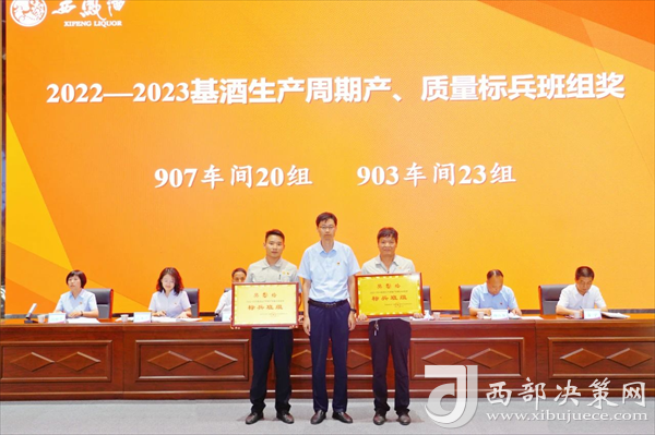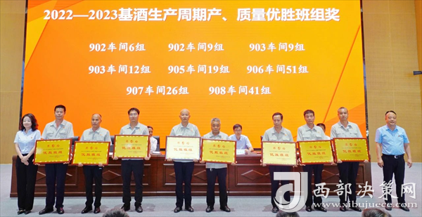 會上,張周虎宣讀了《關(guān)于對2022—2023基酒生產(chǎn)周期產(chǎn)質(zhì)量勞動競賽獲獎車間、班組進行表彰獎勵的決定》。與會領(lǐng)導(dǎo)為受表彰的獲獎車間、班組頒發(fā)獎牌。