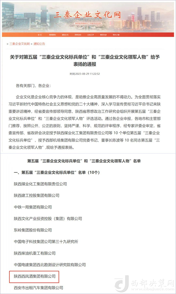 西部決策網(wǎng)訊(記者劉玉 韓宗憲 通訊員 馬迪)近日,從陜西省委宣傳部、陜西省思想政治工作研究會傳來喜訊,西鳳集團公司以在企業(yè)文化建設方面的突出成績,從眾多評選單位中脫穎而出,獲得“三秦企業(yè)文化標兵單位”光榮稱號。