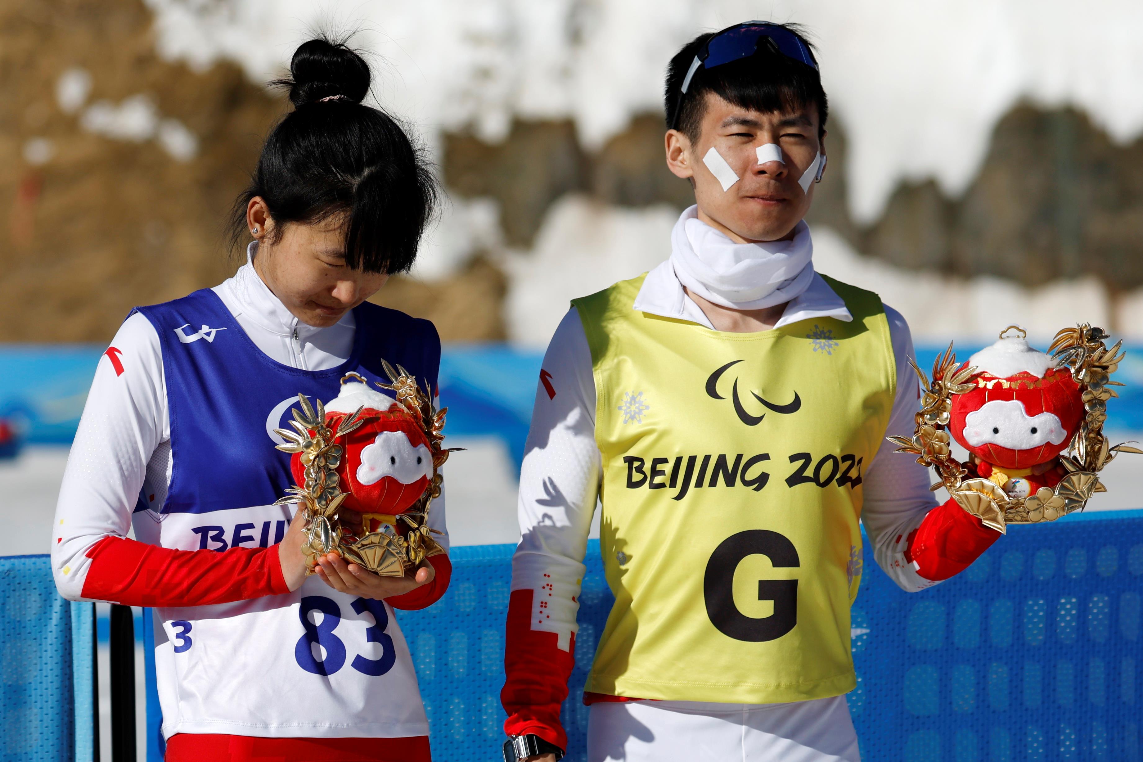 △2022年3月8日,2022冬殘奧會(huì)殘奧冬季兩項(xiàng)女子中距離(視障)比賽中,中國(guó)選手王躍獲季軍。