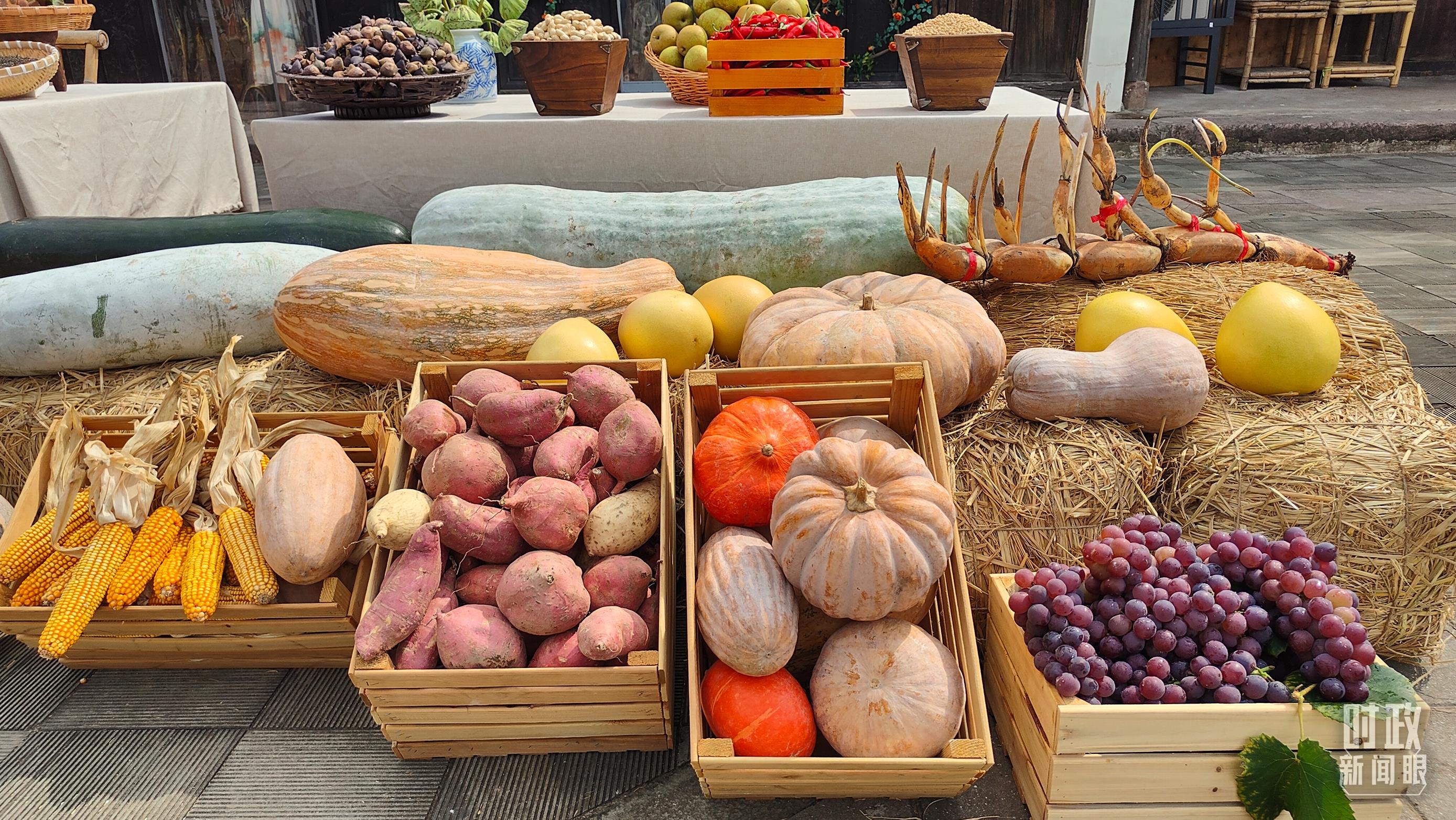 △村廣場(chǎng)“共富市集”,擺放著種類豐富的特色農(nóng)產(chǎn)品。(總臺(tái)央視記者楊立峰拍攝)