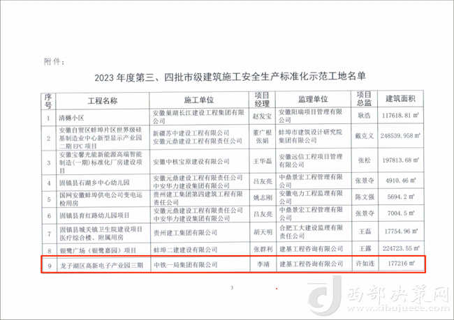 近日,安徽省蚌埠市建筑管理處下發(fā)2023年度第三、四批市級建筑施工安全生產(chǎn)標準化示范工地名單,公司龍子湖區(qū)高新電子產(chǎn)業(yè)園三期EPC項目欣然在列。