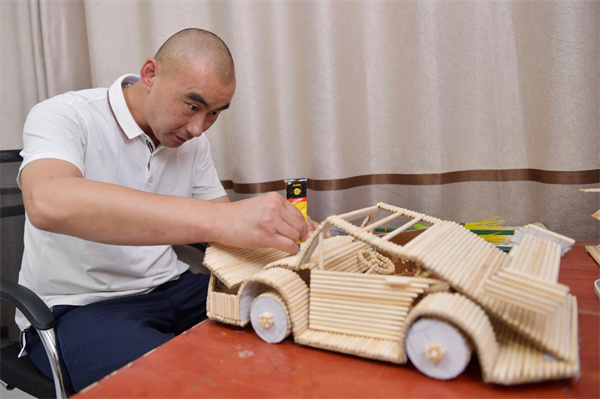 編制了一段時(shí)間的小手鏈、小掛件、小燈籠等等小工藝品后,楊波購(gòu)買(mǎi)了一次性筷子自己做了一個(gè)煙盒。這個(gè)煙盒只要一按按鈕,煙支就會(huì)自動(dòng)彈出,而且煙嘴朝上。隨后,楊波又購(gòu)買(mǎi)了許多一次性筷子,做一輛轎車(chē)模型,不曾想,等到了安裝擋風(fēng)玻璃時(shí),小轎車(chē)散架了。分析原因,是因?yàn)閳A柱狀筷子之間的粘和面積太小不牢靠。楊波找了一些紙板當(dāng)墊板,使筷子的粘和面變成2處,牢固程度提高1倍,前前后后有10多天,一輛筷子車(chē)模做成功了。