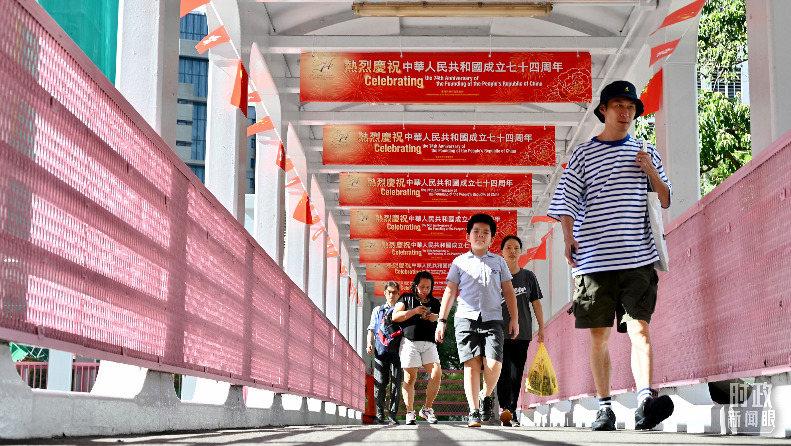 △香港北角的一座天橋,掛滿迎接國慶的橫幅。(圖/視覺中國)