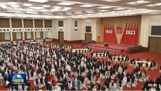 △人民大會堂宴會廳內(nèi),主席臺上方高懸著莊嚴的國徽,“1949-2023”大字年號在鮮艷的紅旗映襯下格外醒目。