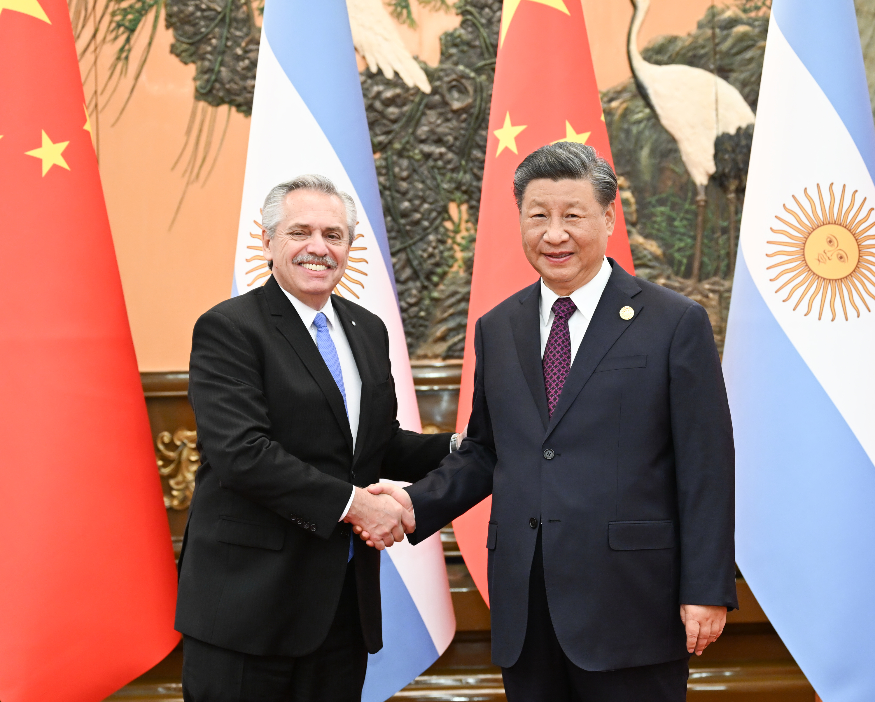 習(xí)近平指出,中阿建交50多年來,雙方始終相互尊重、平等相待、互利共贏。近年來,在我們共同引領(lǐng)下,中阿關(guān)系不斷邁上新臺(tái)階。中阿同為發(fā)展中大國,都肩負(fù)著推動(dòng)國家發(fā)展振興、實(shí)現(xiàn)人民對(duì)美好生活向往、維護(hù)國際公平正義的歷史使命。中方愿同阿方一道,加強(qiáng)戰(zhàn)略對(duì)接,推動(dòng)中阿關(guān)系行穩(wěn)致遠(yuǎn),樹立全球南方國家團(tuán)結(jié)合作的典范。中方支持阿根廷維護(hù)經(jīng)濟(jì)金融穩(wěn)定,愿同阿方分享發(fā)展機(jī)遇,推動(dòng)高質(zhì)量共建“一帶一路”,深化農(nóng)業(yè)、基礎(chǔ)設(shè)施等領(lǐng)域務(wù)實(shí)合作。中方愿進(jìn)口更多阿根廷優(yōu)質(zhì)產(chǎn)品,鼓勵(lì)更多中國企業(yè)赴阿投資。