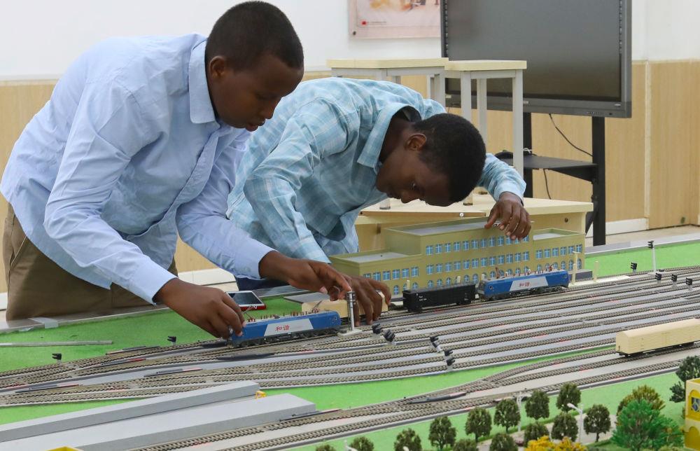 △2022年9月19日,在位于吉布提首都吉布提市的工商學(xué)校,學(xué)生在魯班工坊鐵道運(yùn)營沙盤教學(xué)區(qū)學(xué)習(xí)。