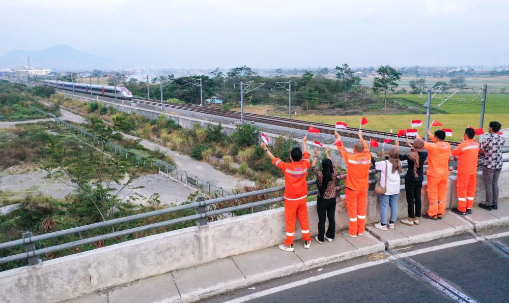 △2023年10月17日,在印度尼西亞萬隆一座天橋上,雅萬高鐵中國建設者和印尼籍員工揮舞著中國和印尼兩國國旗,向遠處駛來的一列雅萬高鐵高速動車組列車歡呼。