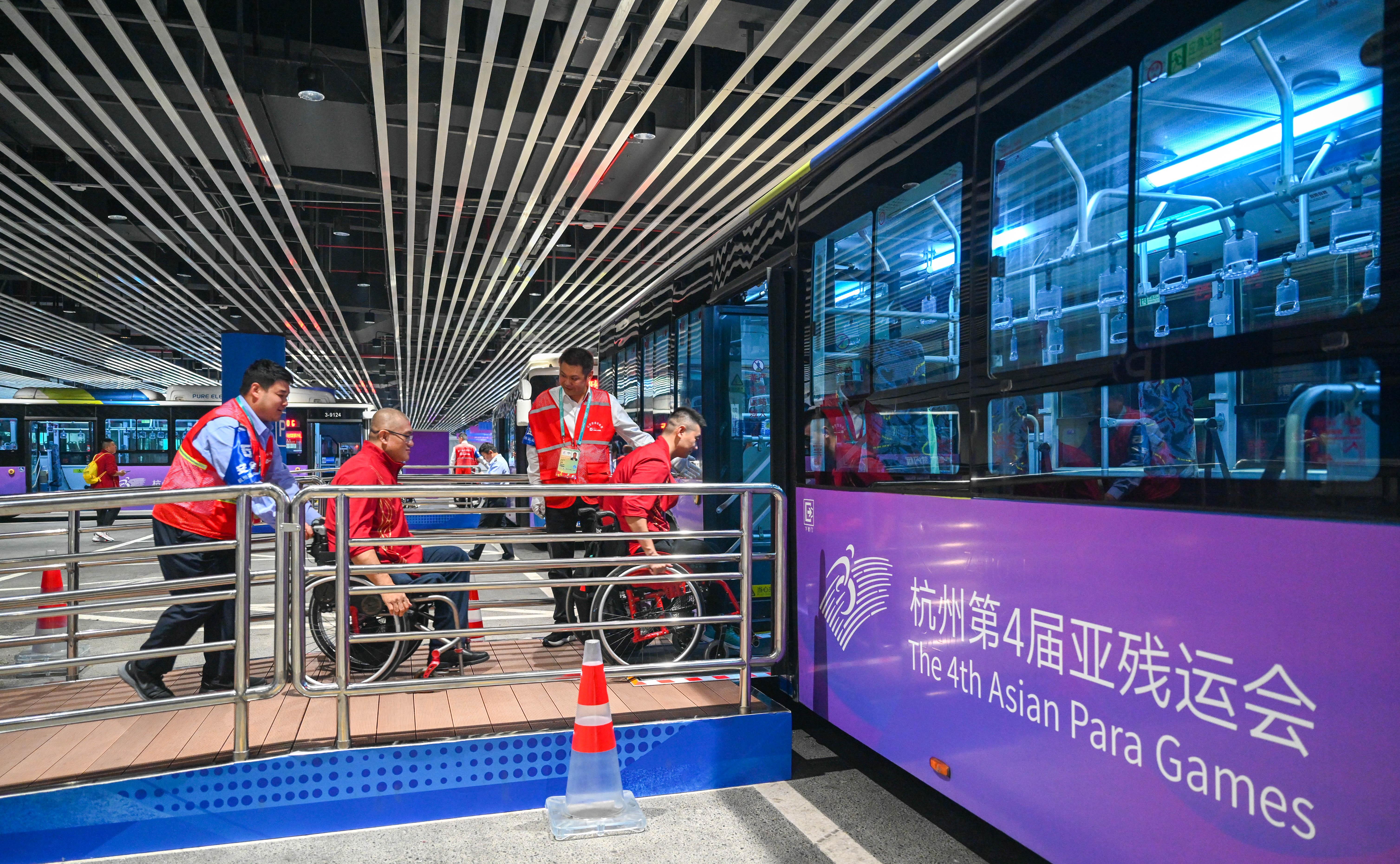 △2023年10月25日,結束輪椅籃球比賽后的中國隊和阿富汗隊球員通過無障礙坡道,順利上車返回運動員村。