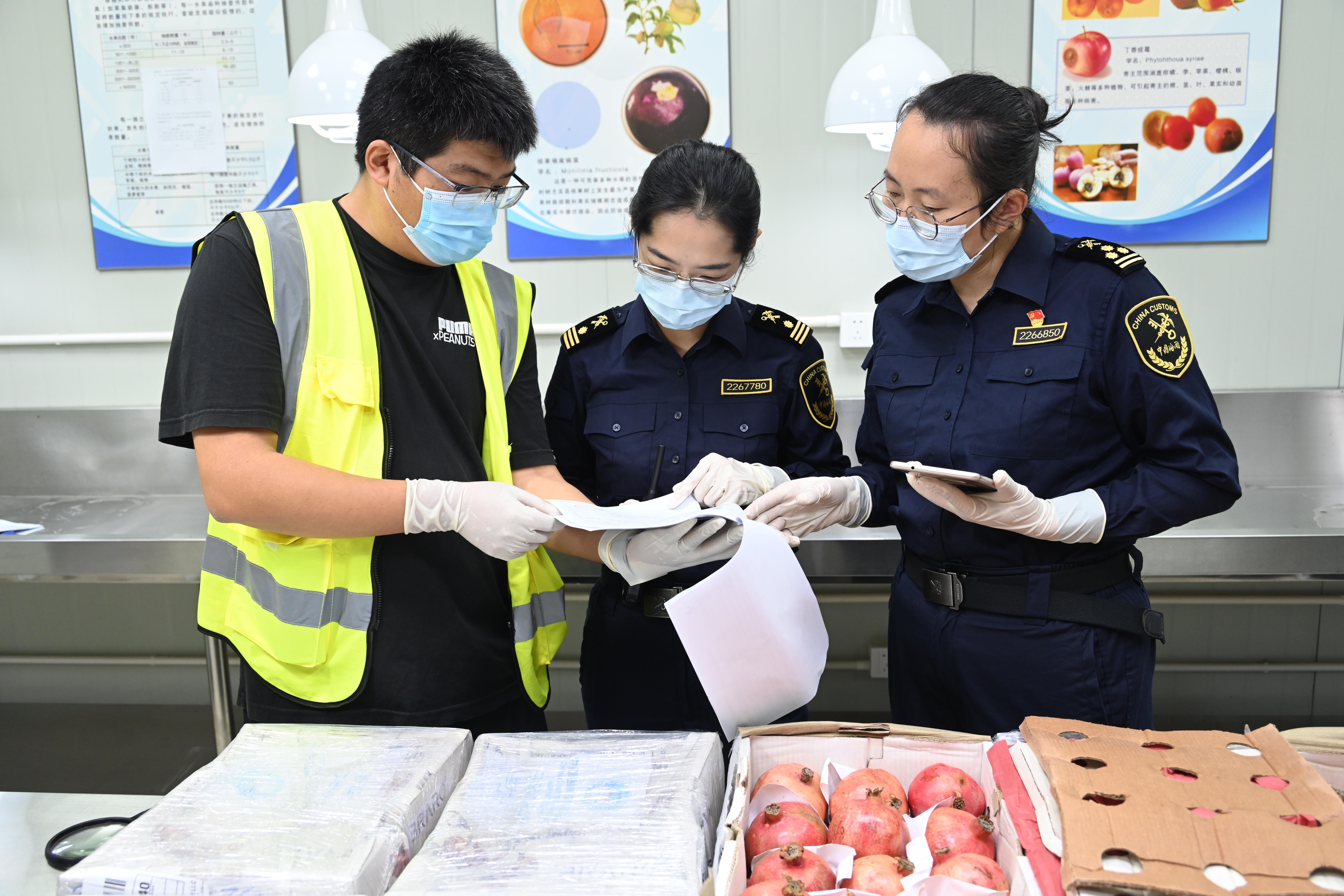 △2023年11月2日,上海浦東國(guó)際機(jī)場(chǎng),經(jīng)海關(guān)檢查無(wú)誤后,一批200千克來(lái)自阿富汗的石榴正常通關(guān),運(yùn)往第六屆進(jìn)博會(huì)現(xiàn)場(chǎng)。