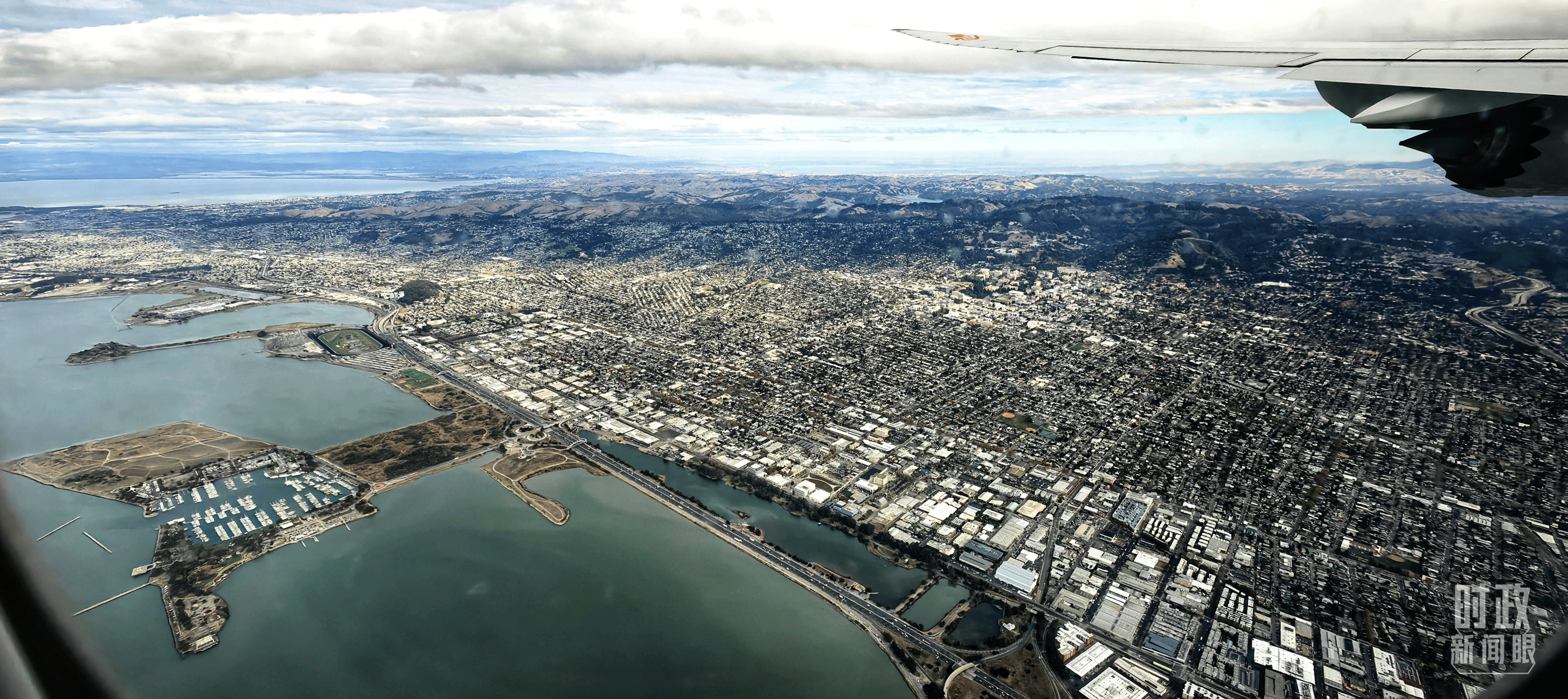 △習(xí)近平乘坐的專機(jī)即將降落舊金山國際機(jī)場。(總臺(tái)央視記者張曉鵬拍攝)