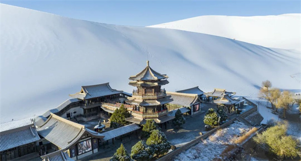 有冬要來,有雪入懷,于淺冬邂逅一場初雪的浪漫,2023年11月14日,甘肅敦煌鳴沙山月牙泉迎來今冬首場降雪,白雪鋪遍沙山峰巒,雪落成詩,滿目雪白,雪后的鳴沙山月牙泉似清逸淡雅的水墨畫,碧藍(lán)的泉水與落雪交相輝映,組成冬日盛景。