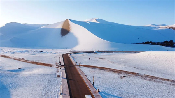 初雪降臨,鳴沙山月牙泉便又浪漫了起來,初雪似筆,將月牙泉清澈的泉水勾勒出來,猶如一彎銀月鑲嵌在沙丘之間,泉水映著沙山雪,微微泛起波紋,像是訴說鳴沙山月牙泉永恒的愛情故事,初冬的月牙泉是碧藍(lán)色的,在落雪的沙漠中俯瞰極為壯觀。
