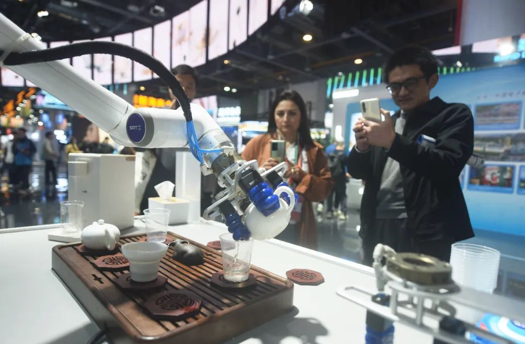 △2023年11月23日,觀眾在第二屆全球數(shù)字貿(mào)易博覽會上觀看機(jī)器人泡茶。