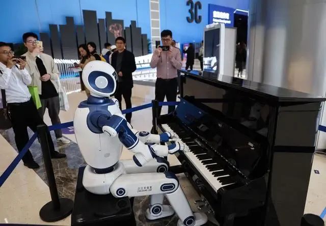 △2023年11月24日,第二屆全球數(shù)字貿(mào)易博覽會上會彈鋼琴的機(jī)器人。