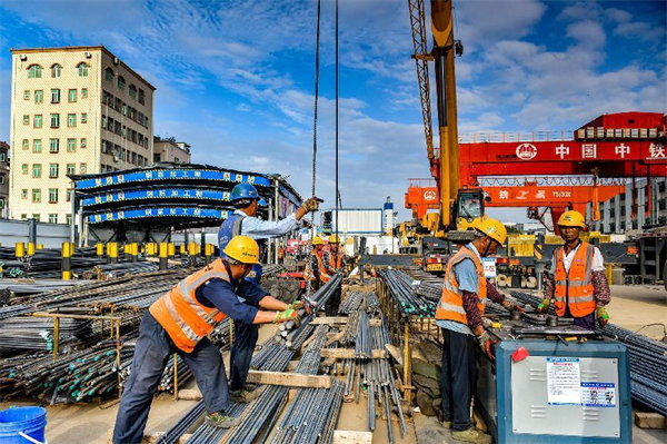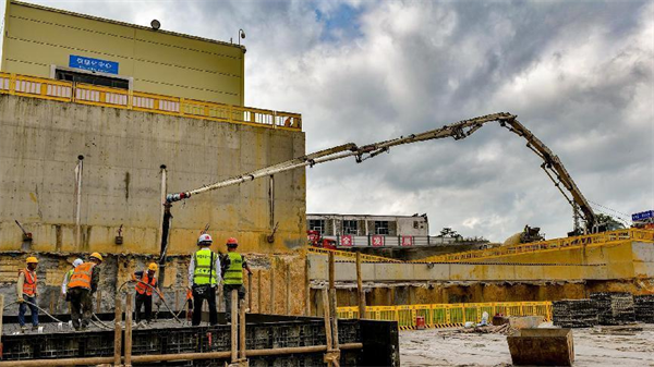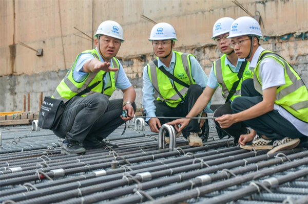 照此安排,項(xiàng)目部各部門、作業(yè)隊(duì)既各自為戰(zhàn),又協(xié)調(diào)統(tǒng)一,按區(qū)域、分專業(yè)、依先后齊頭并進(jìn)。筆者在地面施工區(qū)域看到,盾構(gòu)井臨時封堵板的鋼筋綁扎已經(jīng)完成,8名作業(yè)人員和監(jiān)理、技術(shù)人員在做最后的檢查,混凝土罐車、泵車嚴(yán)陣以待……不一會兒,混凝土順著管子就流向了鋼筋網(wǎng)內(nèi),4名振搗工也隨之開始忙碌,嗡嗡聲響成一片。車站1號鋼筋場,10幾名穿著印有“鋼筋工”“信號司索工”馬甲的工人,或協(xié)助吊車調(diào)運(yùn)鋼筋、或切割鋼筋原材下料;不遠(yuǎn)處,吊車調(diào)運(yùn)明挖段鋼支撐轉(zhuǎn)場……