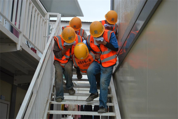 本次演練模擬施工現(xiàn)場電焊作業(yè)不慎點燃易燃材料擠塑板引發(fā)起火,引燃旁邊管理人員宿舍,導致一名人員疏散轉移不及時被困。演練現(xiàn)場設置了現(xiàn)場搶險、醫(yī)療救護、技術保障、物資設備保障、安全警戒、后勤保障6個應急小組。隨著總指揮一聲令下,演練人員立即組織人員緊急疏散,對被圍困的二樓作業(yè)人員進行救援,同時組織人員進行滅火,參演人員按照既定路線有序逃生,安全到達指定地點。同時邀請消防支隊講解常用的消防器材及滅火設施。