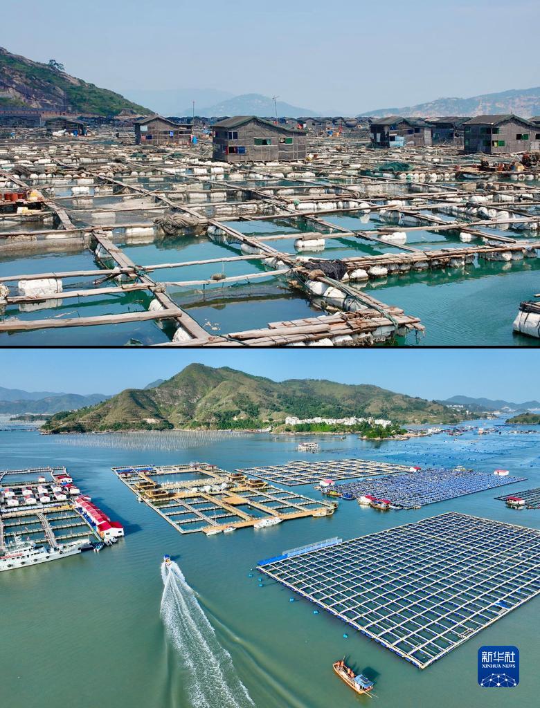 拼版照片:上圖為2007年7月拍攝的福建寧德三都澳海域傳統(tǒng)漁排(資料照片);下圖為2023年11月18日拍攝的福建寧德七星海域升級改造后的漁業(yè)養(yǎng)殖區(qū)(無人機照片,新華社記者姜克紅攝)。新華社發(fā)