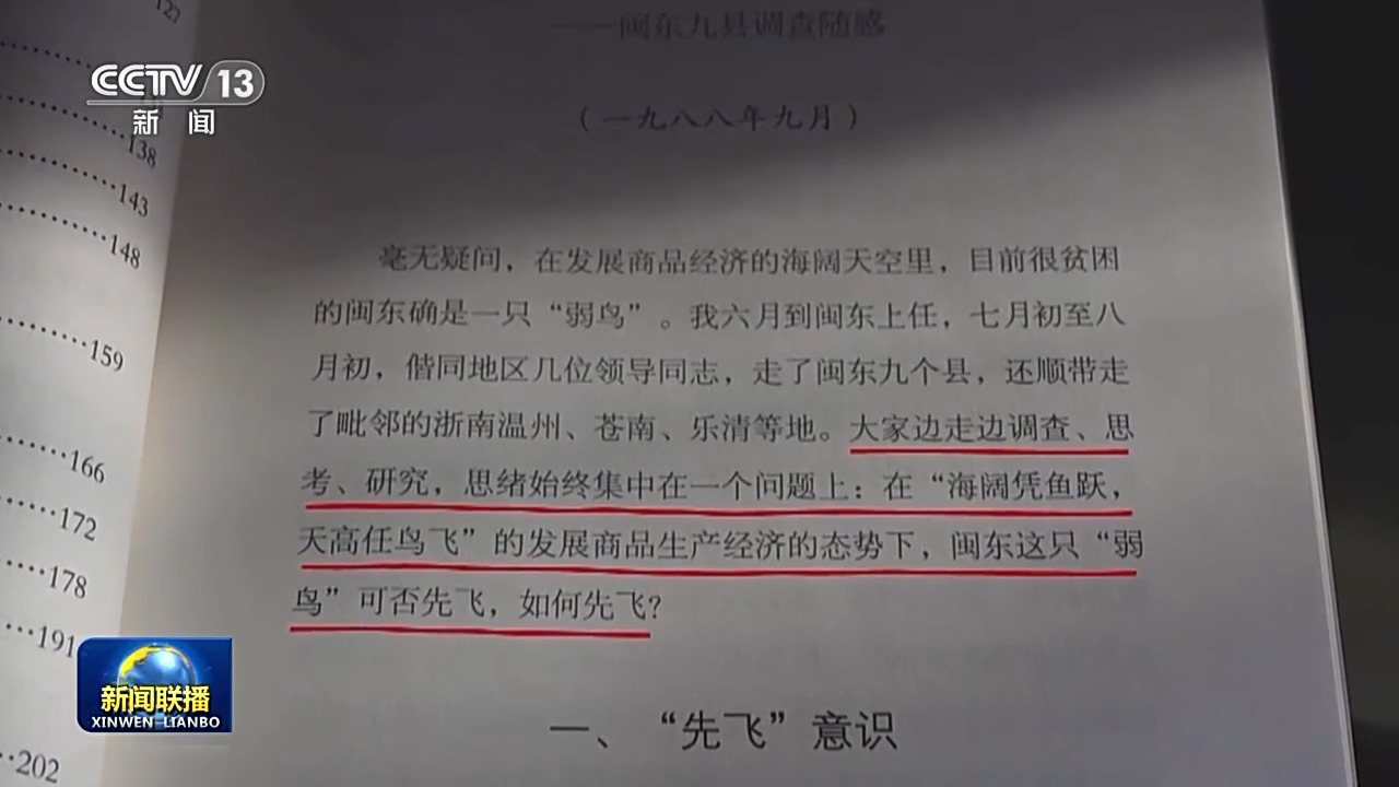 在一個多月里,習近平去了古田、屏南等9個縣的13個鄉(xiāng)鎮(zhèn)、18個村。隨后,他在《弱鳥如何先飛》這篇文章里寫道:大家邊走邊調查、思考、研究,思緒始終集中在一個問題上,在“海闊憑魚躍,天高任鳥飛”的發(fā)展商品生產經濟的態(tài)勢下,閩東這只“弱鳥”可否先飛,如何先飛?
