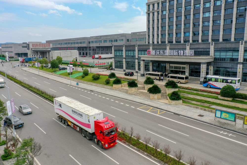 2023年10月11日,滿載筆記本電腦配件、發(fā)電機(jī)組件等產(chǎn)品的西部陸海新通道跨境公路班車從重慶南彭公路保稅物流中心駛出,將途經(jīng)廣西憑祥,直達(dá)越南(無人機(jī)照片)。新華社記者 黃偉 攝