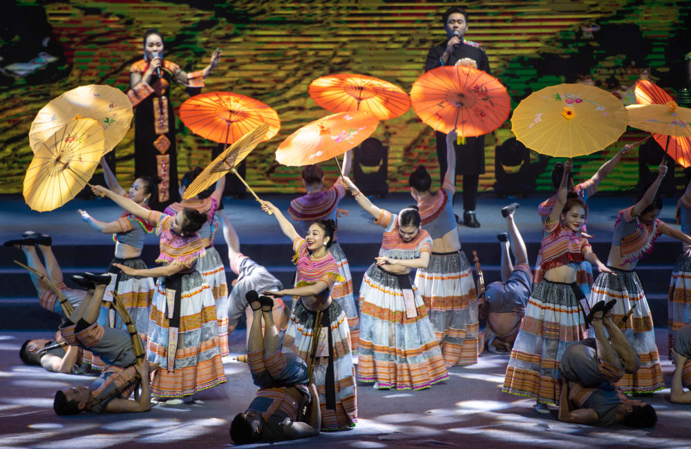 2023年1月18日,以“同心筑厚誼 攜手共發(fā)展”為主題的2023年中越跨國春節(jié)聯(lián)歡晚會(huì)在云南省紅河哈尼族彝族自治州河口瑤族自治縣舉行,越南老街省民族藝術(shù)歌舞團(tuán)的演員在晚會(huì)上表演歌舞《漂浮在云端的節(jié)日》。新華社記者 胡超 攝