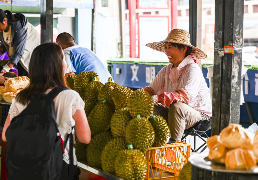 2023年5月18日,越南果商在廣西東興售賣榴蓮。新華社記者 胡星宇 攝