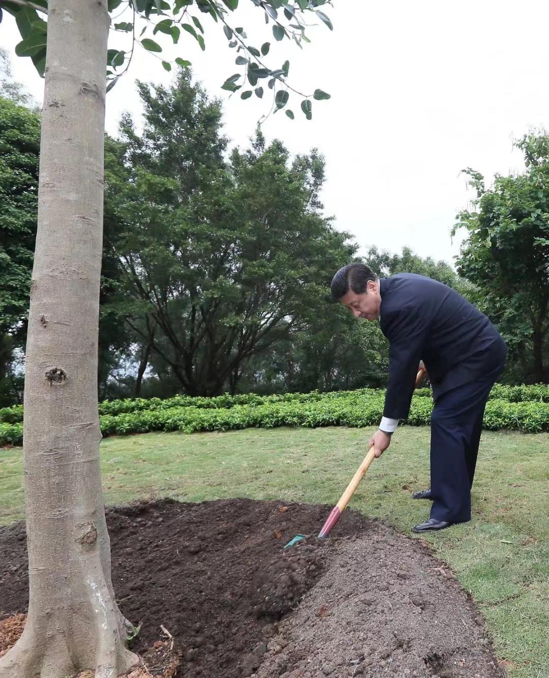 △2012年12月8日,習近平總書記在深圳蓮花山公園,向鄧小平銅像敬獻花籃。離開前,他揮鍬鏟土,種下一棵高山榕樹。