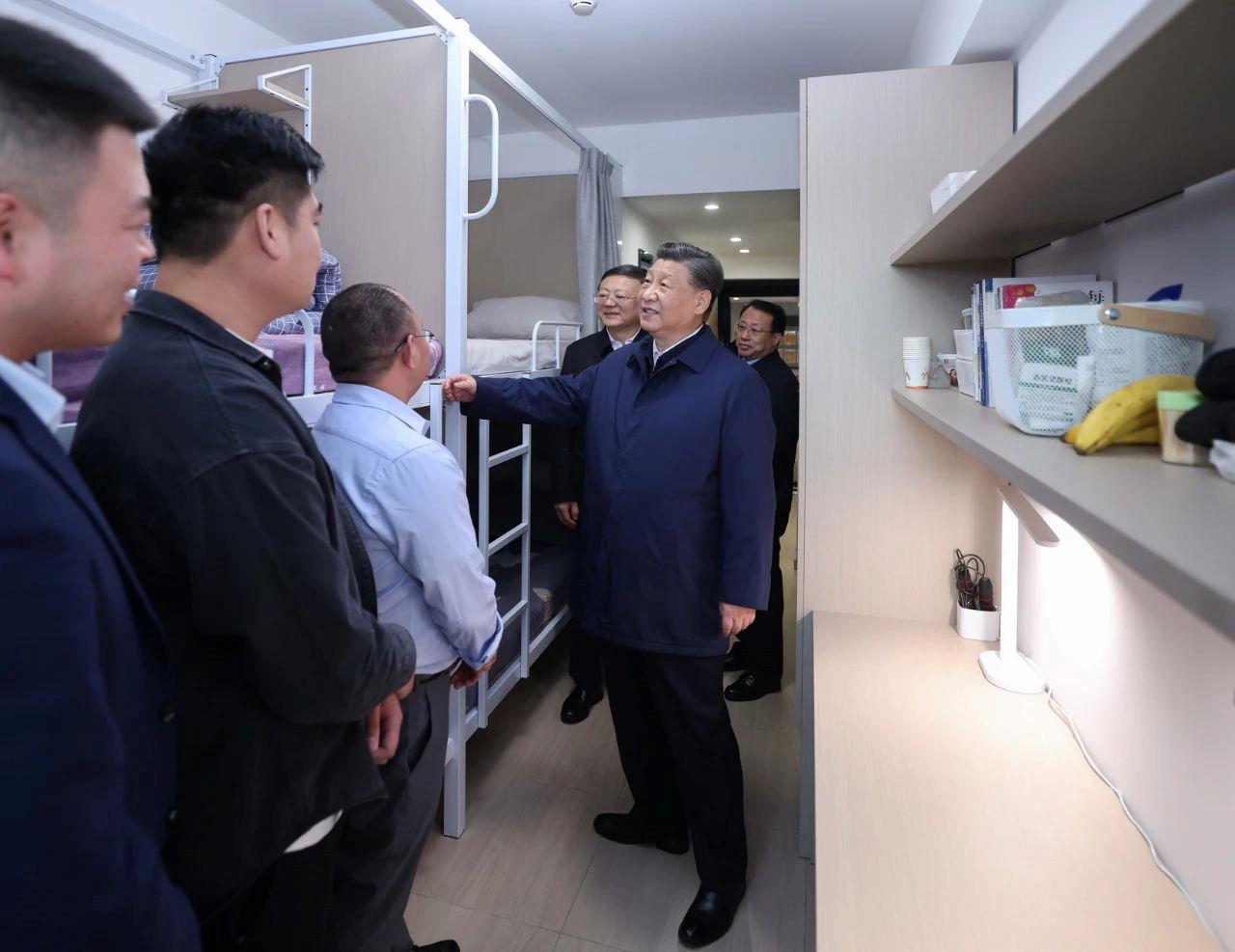 習(xí)近平總書(shū)記走進(jìn)出租房社區(qū),有一棟樓是宿舍型出租房源。其中一個(gè)四人間,租戶都是附近物業(yè)公司的保安。他們說(shuō):“這里有公共的廚房、洗衣房、浴室,還有會(huì)客室,外面有羽毛球場(chǎng)、籃球場(chǎng),蠻好、蠻好!”