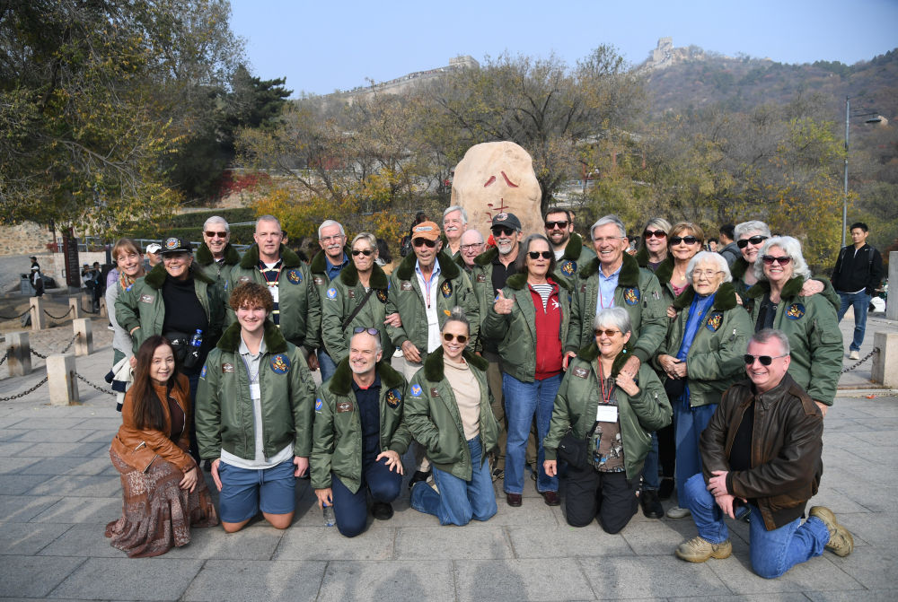 2023年10月29日,飛虎隊老兵莫耶一行人在北京八達嶺長城合影留念。當日,美中航空遺產基金會訪華代表團成員陸續(xù)抵達北京。新華社記者 任超 攝