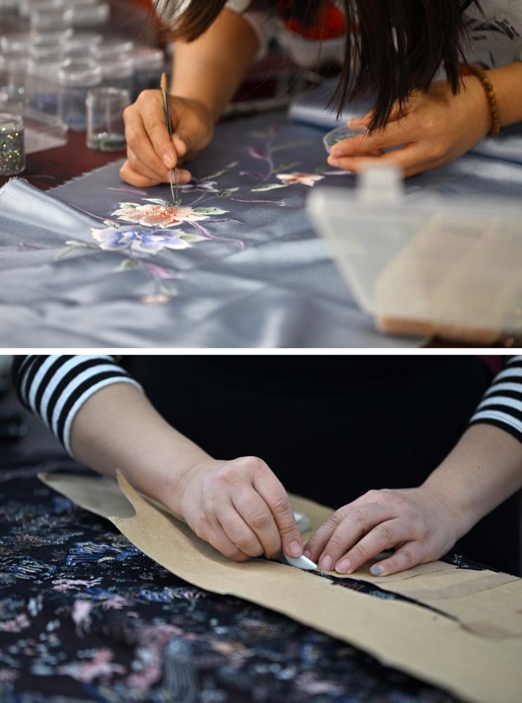 拼版照片:上圖為老美華定制車間的制衣師傅在面料上貼鉆;下圖為老美華定制車間的制衣師傅在面料上劃線(2023年12月8日攝)。天津老美華始創(chuàng)于1911年,歷史上以“千層底”布鞋聞名,是享譽(yù)津門的“中華老字號(hào)”。新華社記者 李然 攝