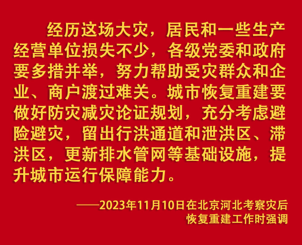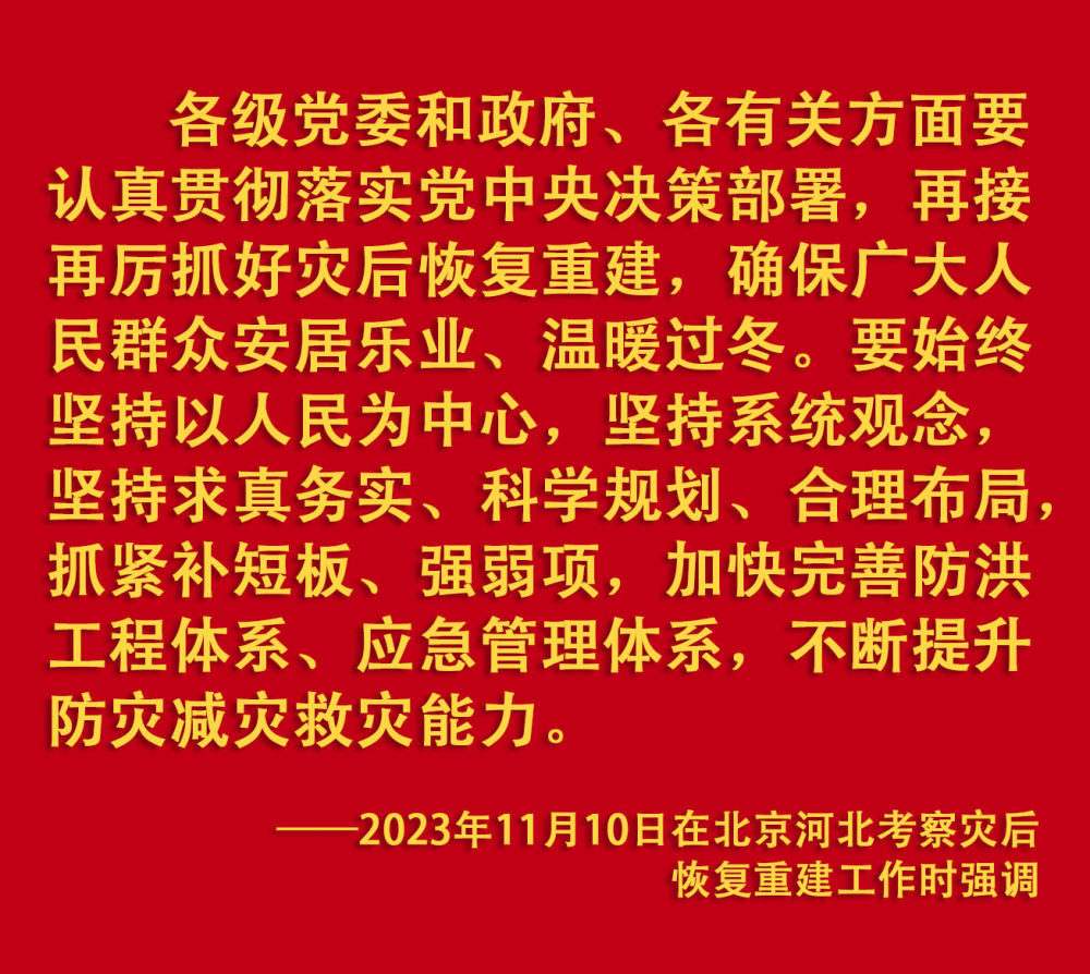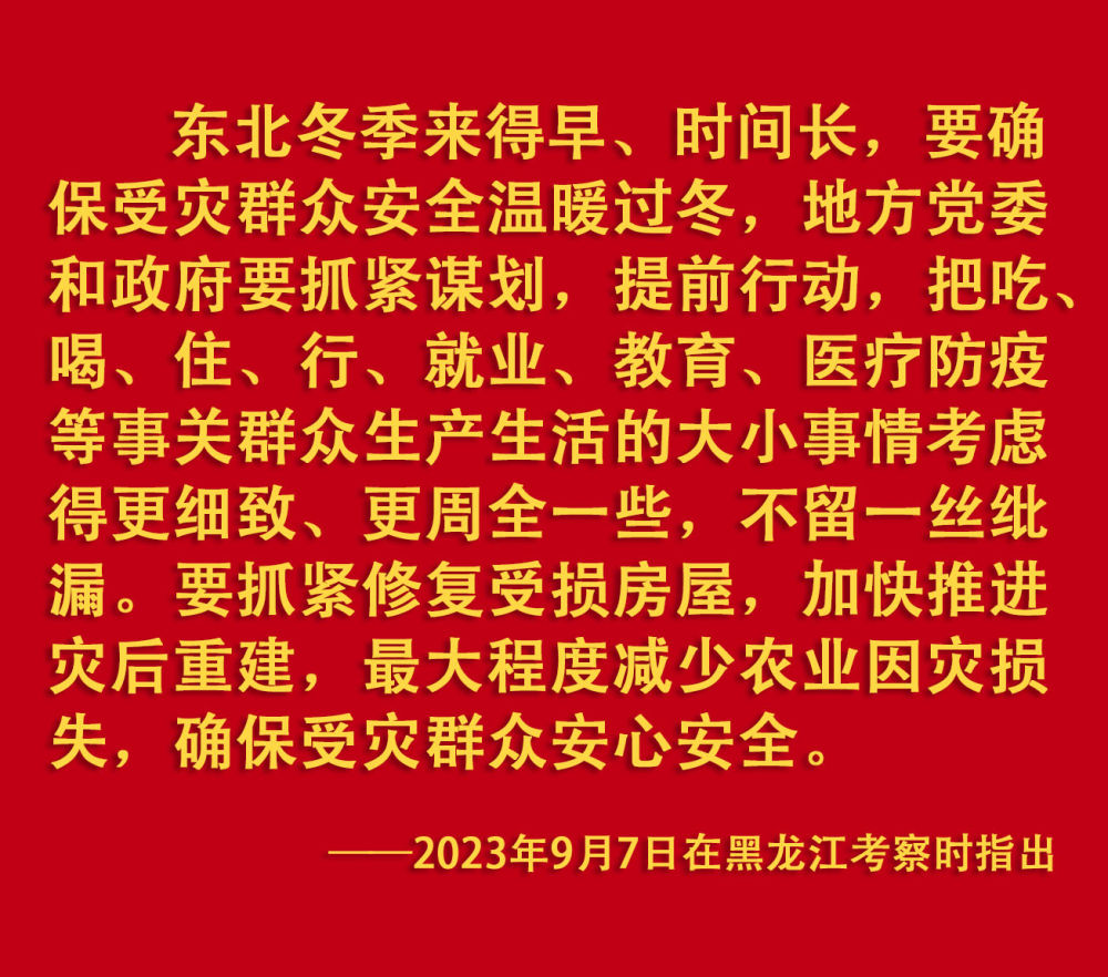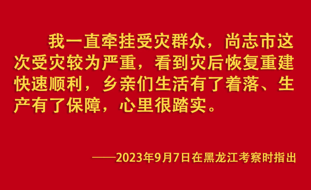 2023年汛期以來,我國華北、東北等地出現(xiàn)極端降雨,引發(fā)洪澇和地質(zhì)災(zāi)害。習(xí)近平一直牽掛著受災(zāi)群眾,高度重視防汛抗洪救災(zāi)和災(zāi)后恢復(fù)重建工作,多次作出重要指示批示,要求有關(guān)地方和部門全力保障人民群眾生命財(cái)產(chǎn)安全,盡快恢復(fù)災(zāi)區(qū)正常生產(chǎn)生活秩序。2023年9月上旬,習(xí)近平前往黑龍江尚志市看望慰問受災(zāi)群眾;11月,北方入冬之際,習(xí)近平又來到北京、河北受災(zāi)較重的相關(guān)地區(qū),看望慰問受災(zāi)群眾,檢查指導(dǎo)災(zāi)后恢復(fù)重建工作。