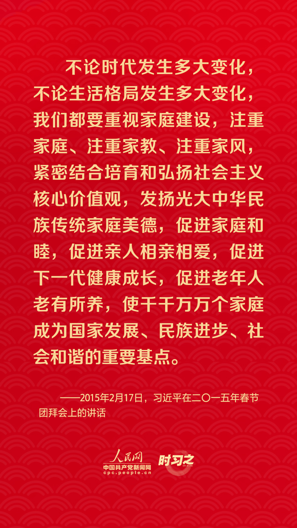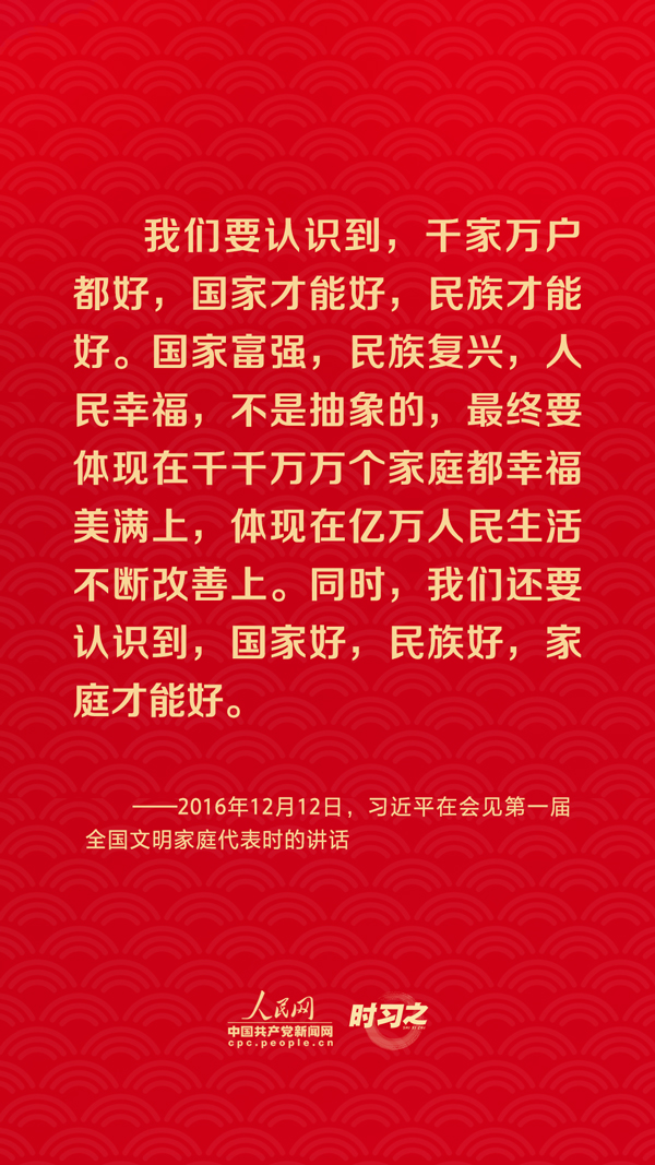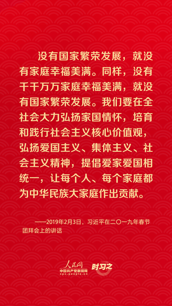 團(tuán)圓是春節(jié)永恒的主題。“沒有國家繁榮發(fā)展,就沒有家庭幸福美滿。同樣,沒有千千萬萬家庭幸福美滿,就沒有國家繁榮發(fā)展。”習(xí)近平總書記曾在多個場合深刻闡述家庭與國家之間的關(guān)系,從他的話語里一起感悟深厚的家國情懷。
