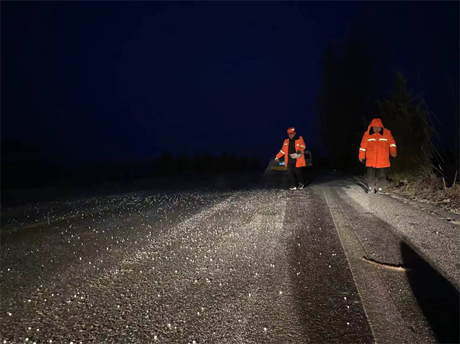除雪保暢小分隊在G344堯典段人工撒融雪劑除冰