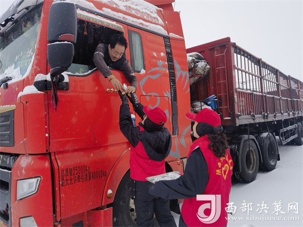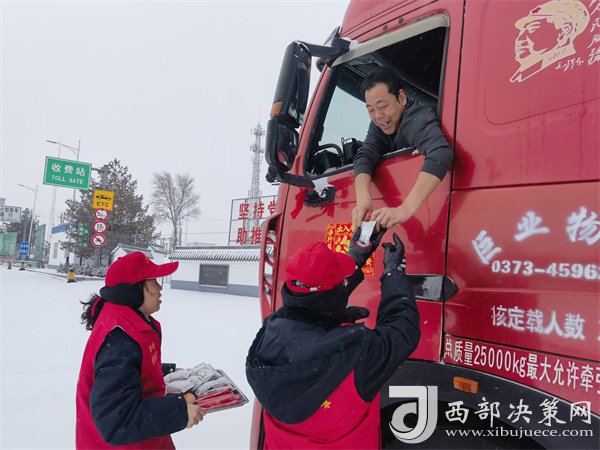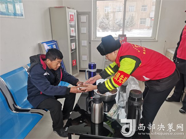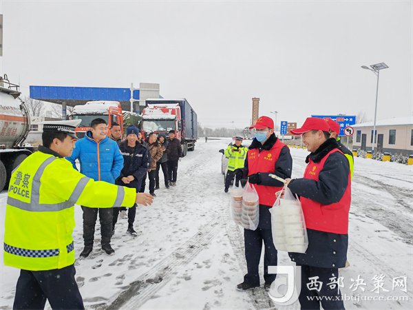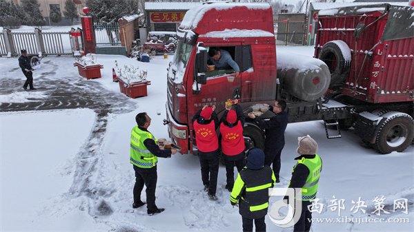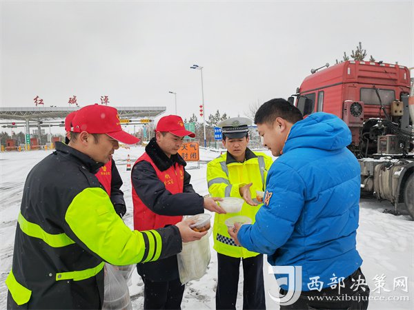 這有小米粥、炸油餅,雞蛋還熱乎著……”榆靖分公司志愿者暖心地喊著話。“行動(dòng)是最好的破冰劑”,志愿者們?yōu)楦咚贉袈每退腿ナ澄铮旓L(fēng)冒雪分發(fā)給滯留在收費(fèi)站的司乘人員。一件件穿梭在寒風(fēng)中的“紅馬甲”此刻成為了冬日里最美的“志愿紅”,讓群眾在寒意逼人的天氣里感受到了一份特別的溫暖。大家紛紛表示感謝,“熱粥、小菜、松軟的饅頭下肚,全身都熱乎了。”一名滯留司機(jī)真誠地感激道。