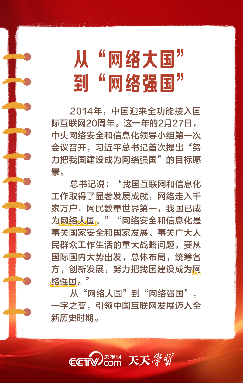 天天學(xué)習(xí) 黨的十八大以來,習(xí)近平總書記高度重視網(wǎng)絡(luò)強(qiáng)國建設(shè),在網(wǎng)絡(luò)強(qiáng)國建設(shè)實(shí)踐基礎(chǔ)上,提出了一系列新思想、新觀點(diǎn)、新論斷,形成了關(guān)于網(wǎng)絡(luò)強(qiáng)國的重要思想。在這一重要思想引領(lǐng)下,我國互聯(lián)網(wǎng)發(fā)展進(jìn)入全新時(shí)代,網(wǎng)絡(luò)強(qiáng)國藍(lán)圖徐徐鋪展。