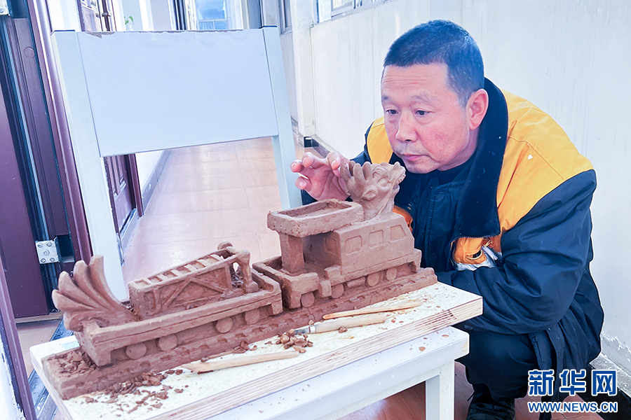劉建強(qiáng)在宿舍雕刻泥塑“龍頭軌道車”。張贏弘 攝