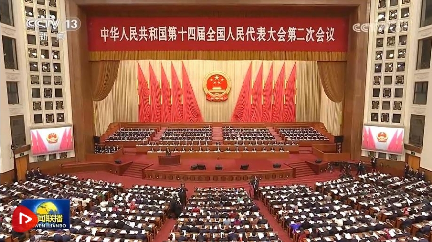 上午9時(shí),趙樂際宣布:中華人民共和國第十四屆全國人民代表大會(huì)第二次會(huì)議開幕。會(huì)場全體起立,高唱國歌。