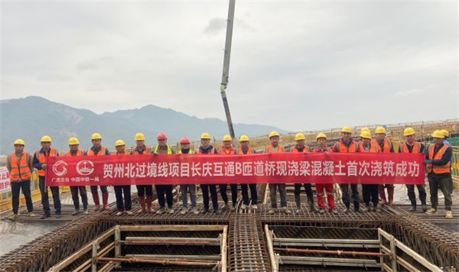 3月6日下午3點(diǎn),經(jīng)過作業(yè)人員8個(gè)小時(shí)連續(xù)鏖戰(zhàn),由中鐵一局三公司承建的賀州北過境線長慶互通B匝道橋完成首次350方混凝土澆筑,按下了項(xiàng)目復(fù)工復(fù)產(chǎn)的加速鍵。