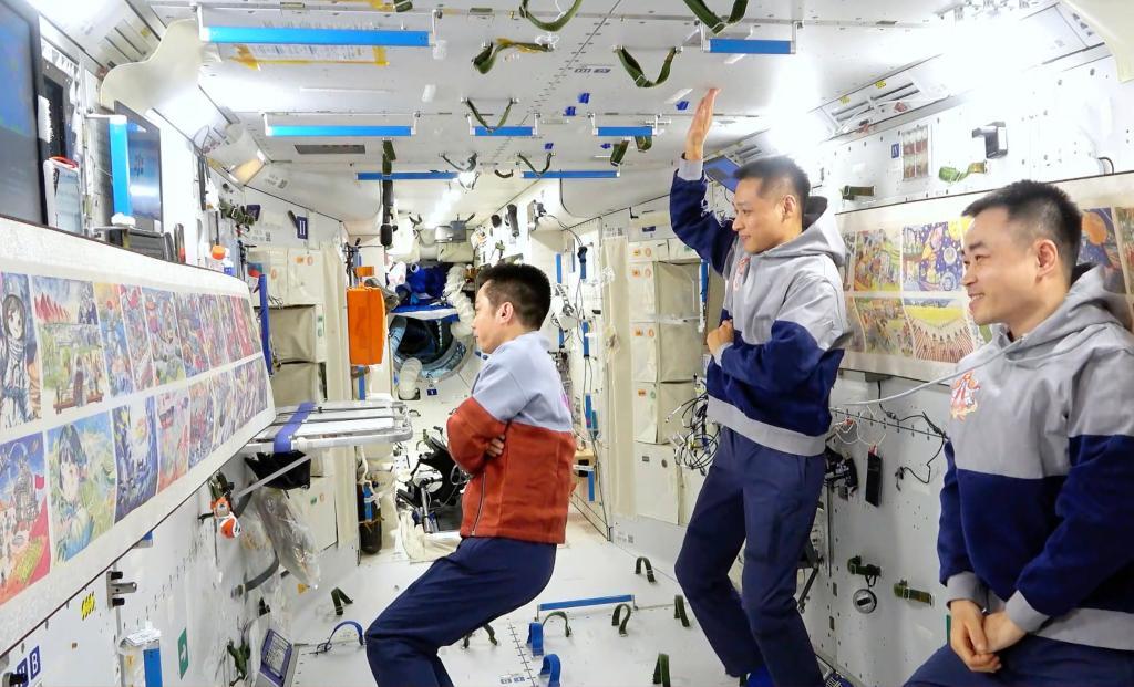 △2024年2月23日,神舟十七號航天員乘組在軌展示和介紹第三屆“天宮畫展”作品。